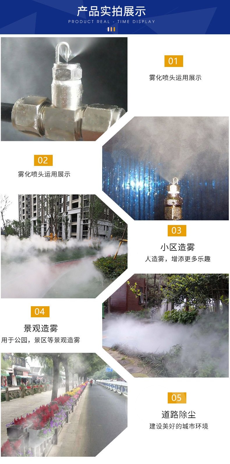 应用:1. 它具有造景、美化环境的功能,可广泛应用于园林景观效果,如公园、园林绿化区、假山瀑布、配合各式喷泉、景观湖等。2. 它具有增湿、降温、隔热、除尘除味的效果,适用范围包括:游乐场、体育馆、高尔夫球场、温室、厂房车间、大棚等。3. 它还具有防尘功能,可用于水泥厂、公路收费站的空气除尘。
