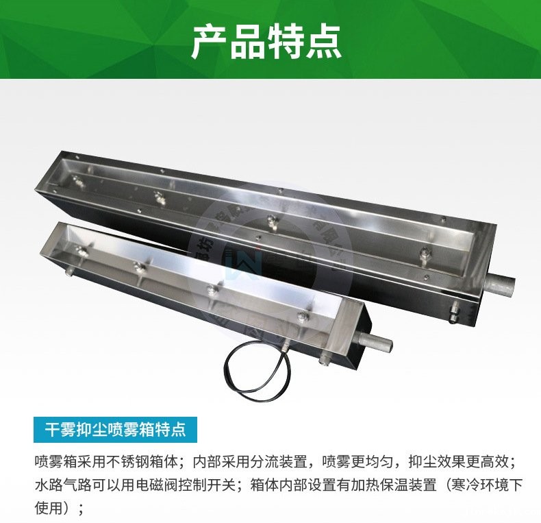 干雾箱采用304不锈钢箱体,内部采用水路、气路分流装置,喷雾更均匀。箱体内可设置加热保温装置。每个箱体安装4-8个干雾喷嘴。